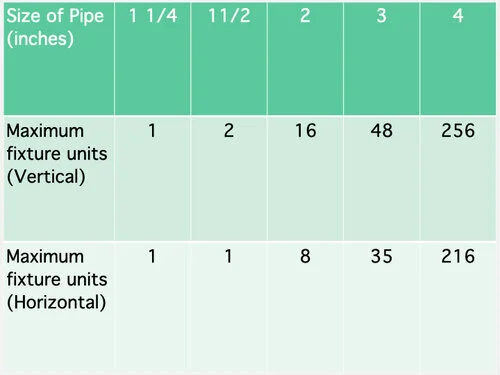 For example, a typical branched drain system may include a shower(2 units), a sink (1 unit), a bathtub(2) and a laundry (3) for a total of 8 units, which still fits in a 2” pipe but is the maximum units allowed in that pipe size.