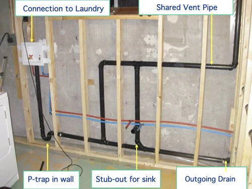 Even though laundry graywater is often sent through an independent “Laundry-to-Landscape” system, it can also be sent through a branched drain or combined into a whole-house system. The drainpipe your laundry discharge hose empties into should be a 2” size and has a non-visible P-trap connected to it located inside the wall. Sink drain pipes can be as small as 1 1/4” or 1 1/2” and sometimes share vents with other fixtures or use an isolated vent such as an auto vent.