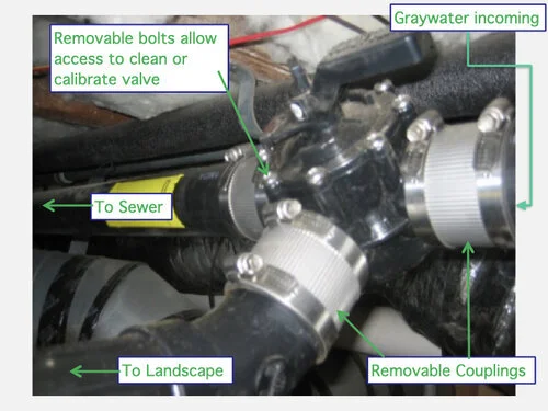 A backwater valve (aka “sewer check valve”) is typically installed on the sewer side of the 3-way valve to prevent sewer water from potentially backing up into the graywater system