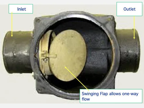 AKA Sewer Check Valve is usually installed on the sewer side of the 3-way valve to prevent sewer water further downstream from backing up into the greywater system. Since the 3-way valve itself shuts off the sewer connection, the backwater valve functions only if the 3-way valve is left partially open, and this component is Not required by all jurisdictions. Must be installed in the correct orientation with flow arrows pointing downstream in order to function correctly.